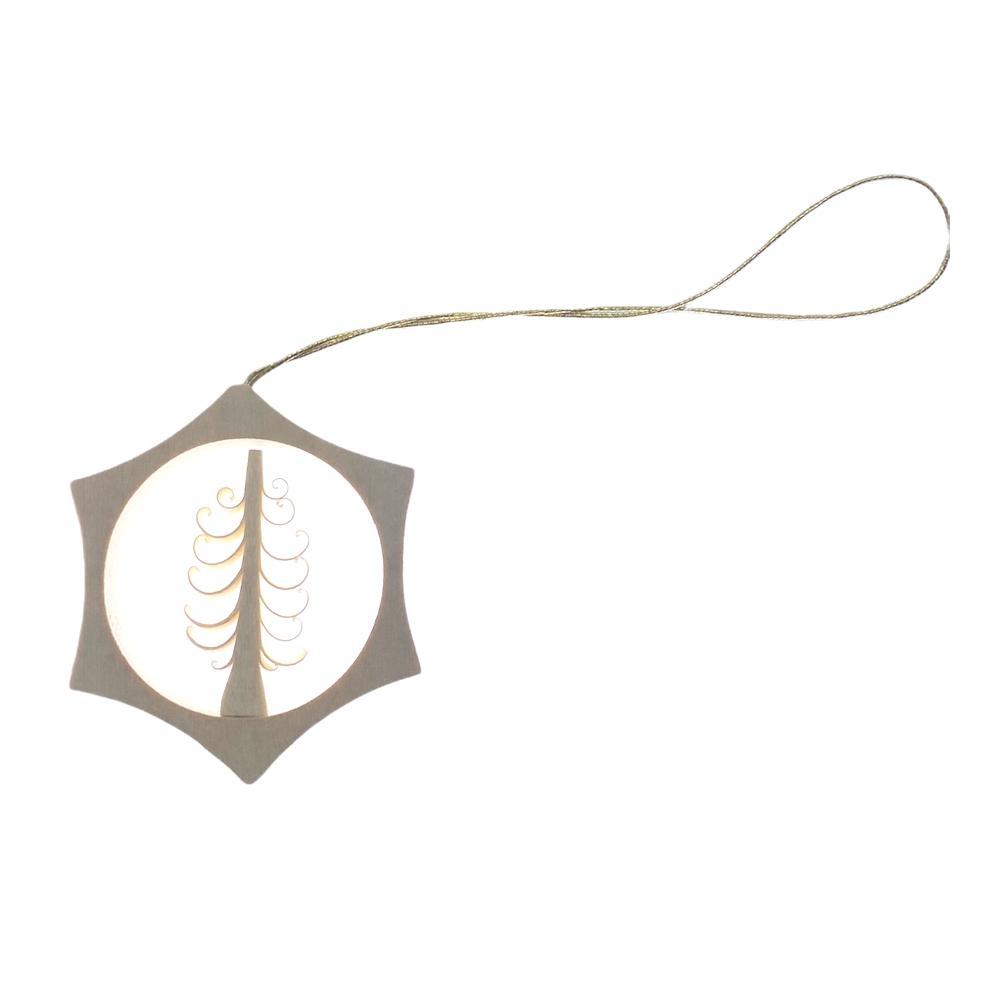 Mit größter Sorgfalt hergestellt und aus ausgewählten Hölzern gefertigt ist dieser Baumbehang ein Hingucker an jedem Weihnachtsbaum. Im Sternförmigen Rahmen aus Lindenholz steht jeweils ein filigran gefertigter Spanbaum.