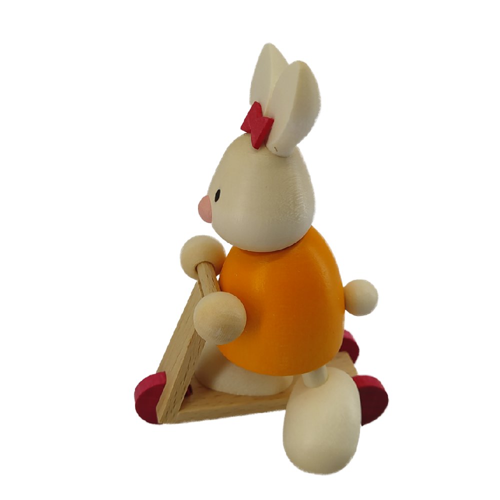 Außerdem erhält jede einzelne Figur aus dem Hause Hobler ein kleines silbernes Herz am linken Fuss, als unverwechselbares Erkennungszeichen – eben ein richtiger kleiner Kerl mit Herz. Dieser knuffige Hase wird aus Ahorn- und Birkenholz, liebevoll von Hand gefertigt und mit kräftigen, fröhlichen Farben bemalt.