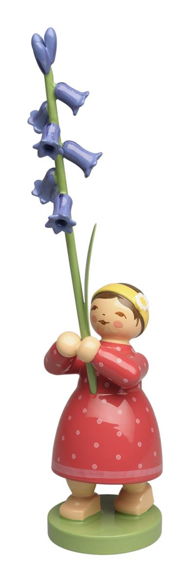 Ein zauberhaftes neues Blumenmädchen bereichert die Schar der Blumenkinder in diesem Jahr. Das Mädchen mit Hasenglöckchen trägt eine wunderschöne Frühlingsblume über die Wiesen. In seinem roten Kleid mit den zarten Punkten leuchtet es auf der grünen Wiese. Das dunkle Haar träft es zu einem Pferdeschwanz gebunden und das gelbe Haarband mit kleiner weißer Blume schützt vor dem manchmal noch kühlen Frühlingswind.