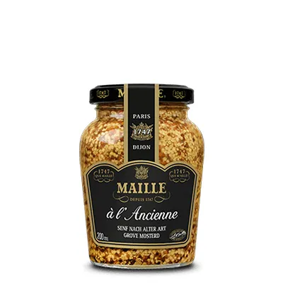 Bereits seit 1747 stellt Maille Senf-Spezialitäten in Frankreich her – Erfahrung, die Sie besonders beim Senf à l‘Ancienne schmecken. Nach alter Art hergestellter Dijon-Senf, der mit Weißwein raffinert verfeinert wird – eine echte Spezialität. Den Dijon Senf, à l‘Ancienne, der Marke Maille erhalten Sie in einem 200 ml Tiegel.