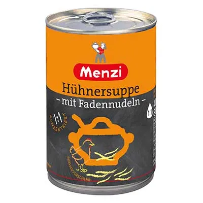 Menzi, Hühner-Suppe mit Fadennudeln, 400 ml Dose.