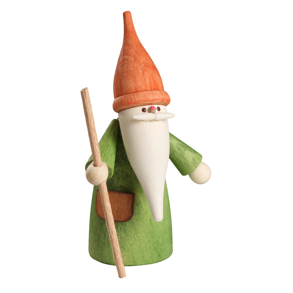 Ein Schäferwichtel mit einem langen weißen Bart und einer langen orangenen Mütze, dazu hat er einen langen hölzernen Stab in der Hand.