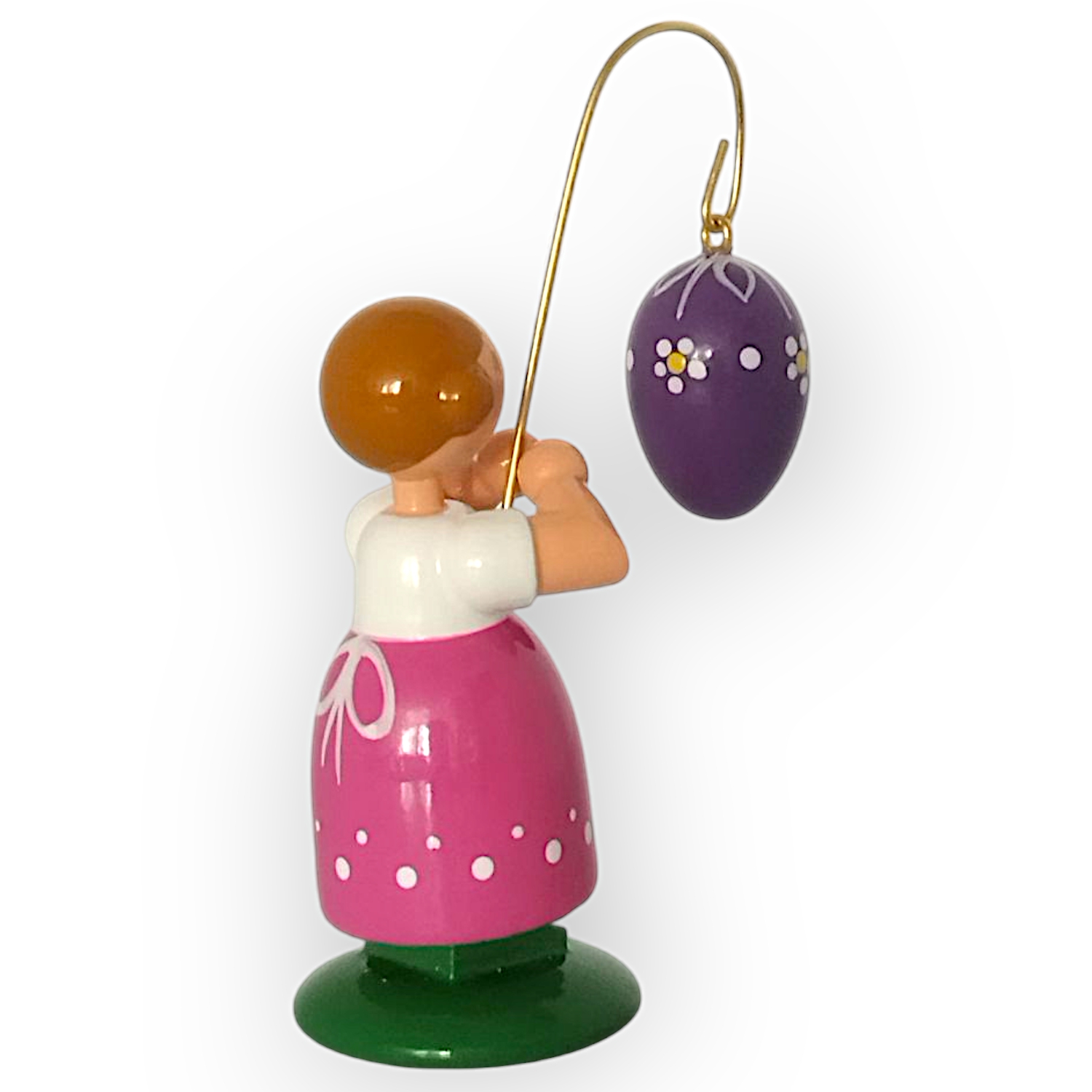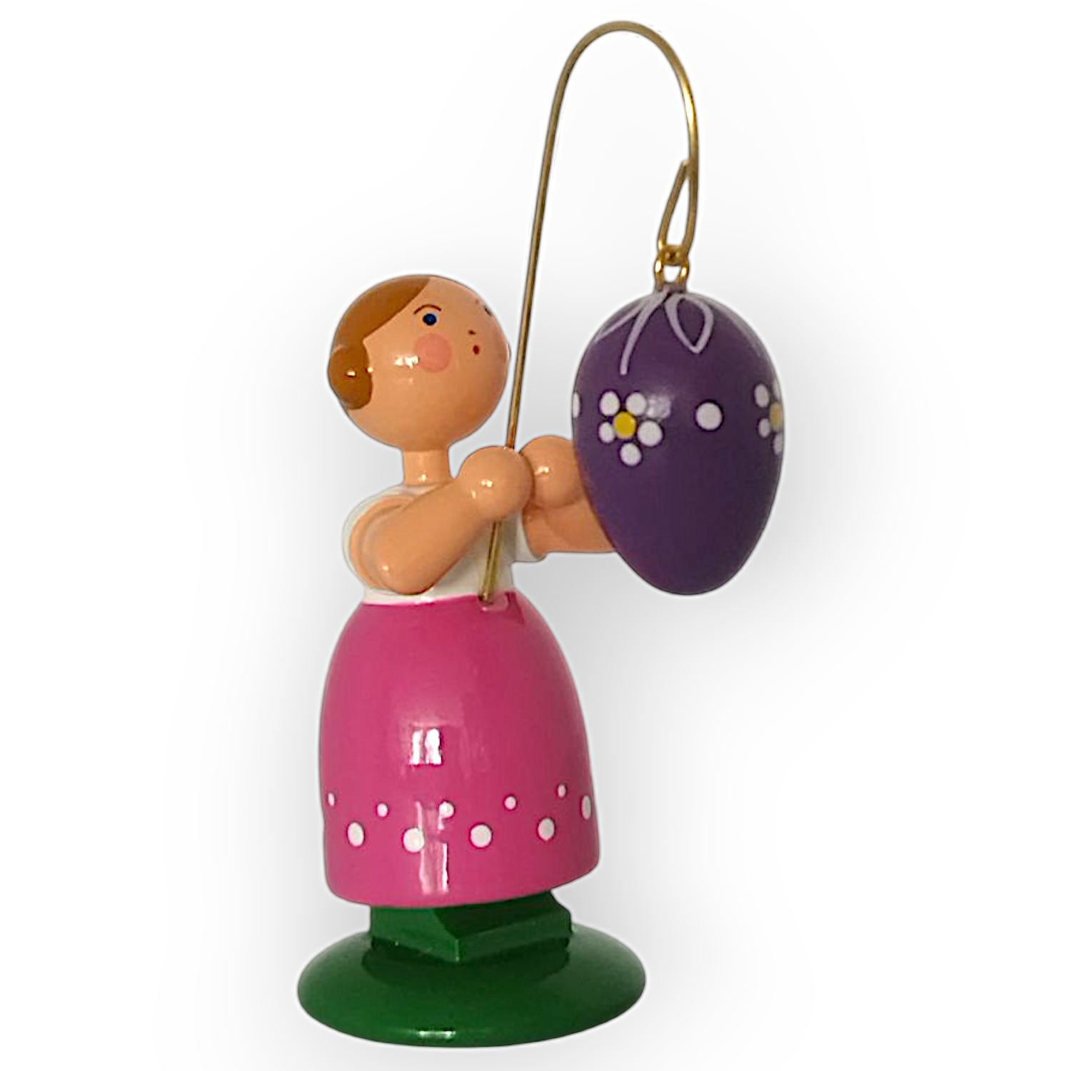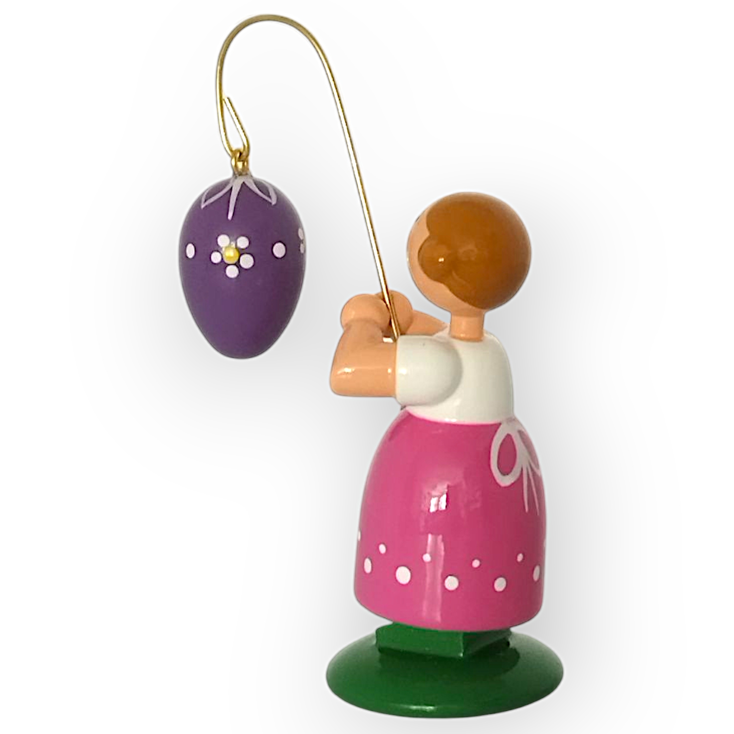 In ihren Händen hält sie einen goldenen Stab, an dem ein lilafarbenes Osterei hängt. Das Ei besticht durch seine weißen Muster, die es zu einem Blickfang machen und die farbenfrohe Gestaltung der Figur abrunden. Jedes Detail des Ostereis wirkt sorgfältig ausgearbeitet und fügt sich perfekt in das Gesamtbild ein.