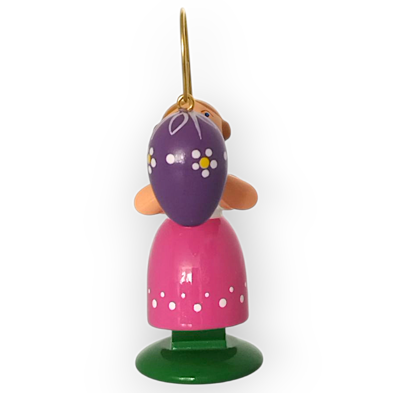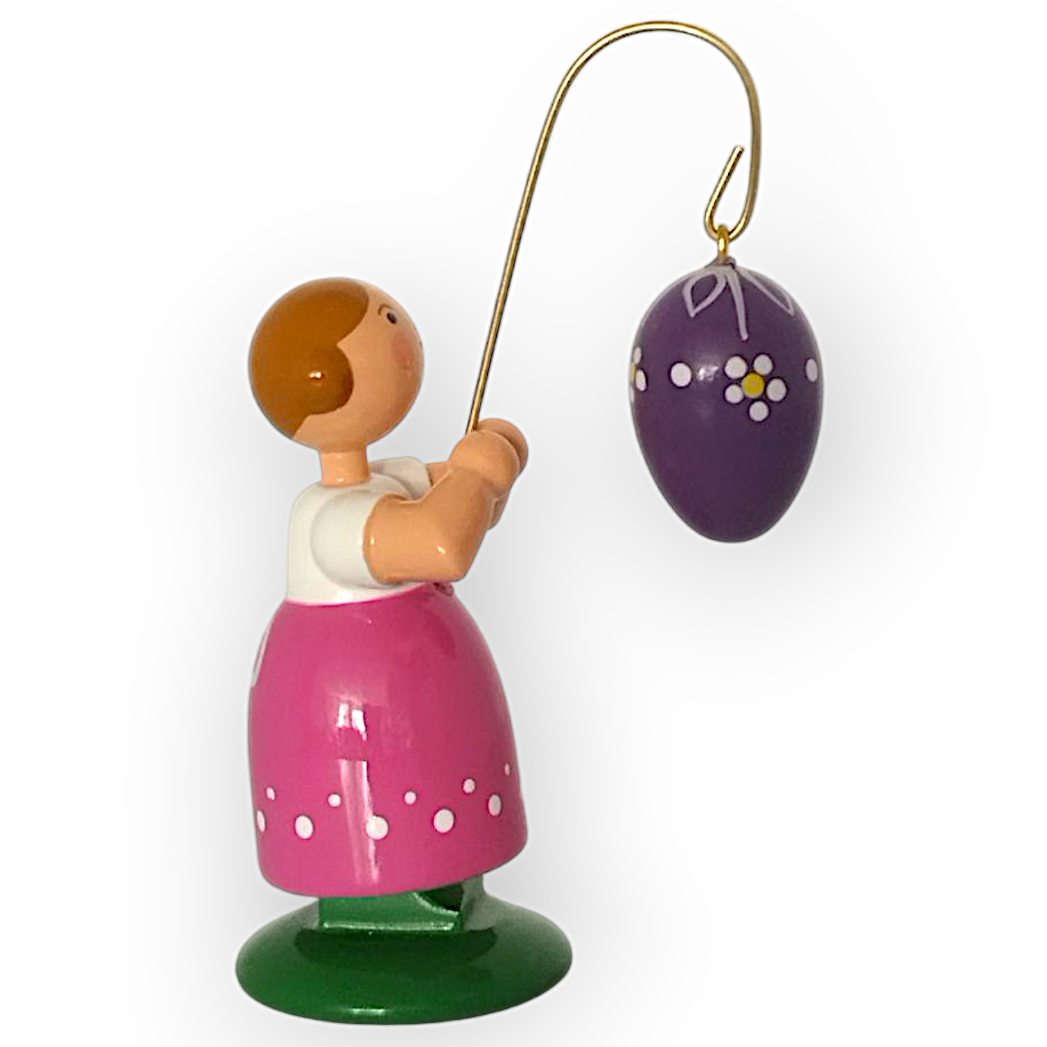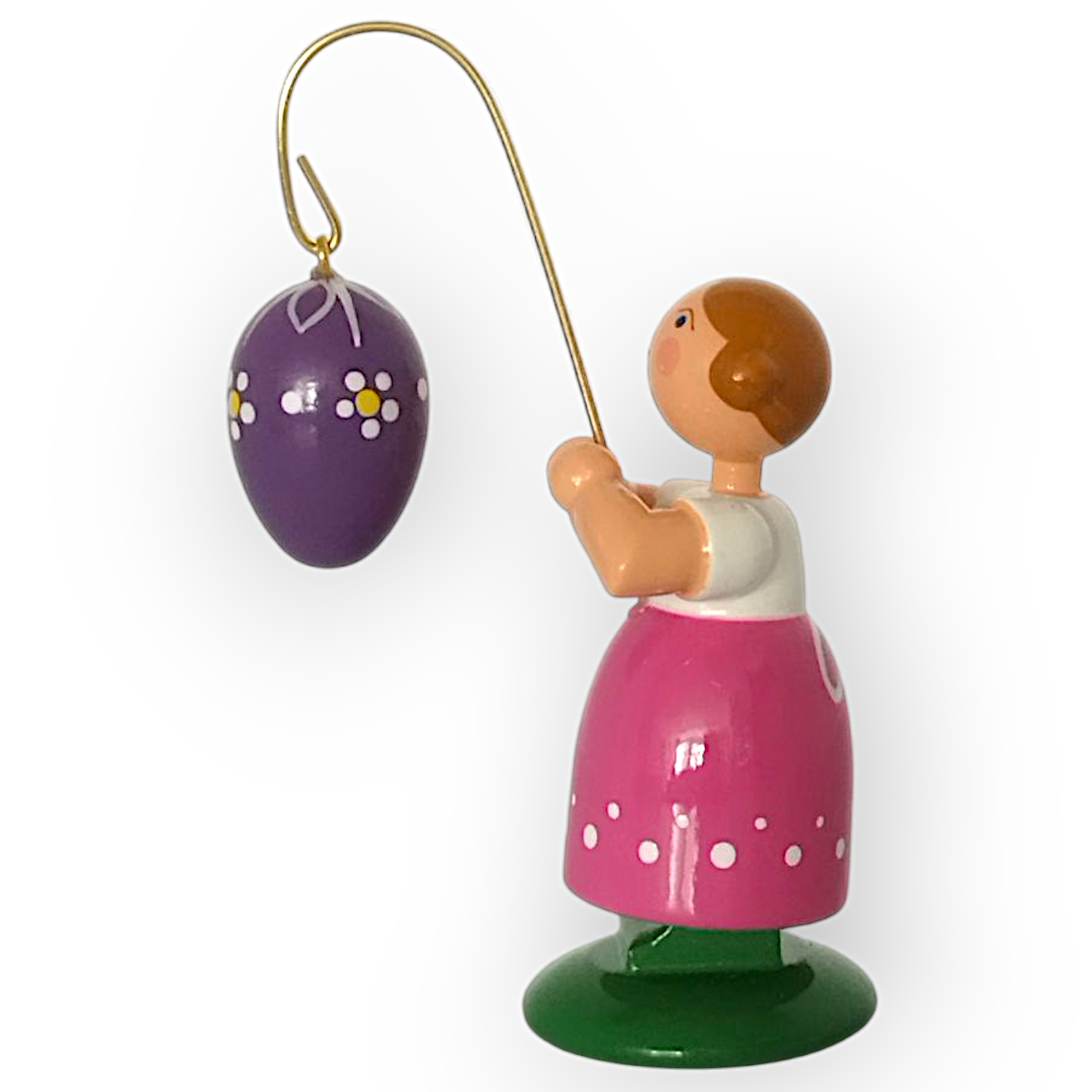 In ihren Händen hält sie einen goldenen Stab, an dem ein lilafarbenes Osterei hängt. Das Ei besticht durch seine weißen Muster, die es zu einem Blickfang machen und die farbenfrohe Gestaltung der Figur abrunden. Jedes Detail des Ostereis wirkt sorgfältig ausgearbeitet und fügt sich perfekt in das Gesamtbild ein.