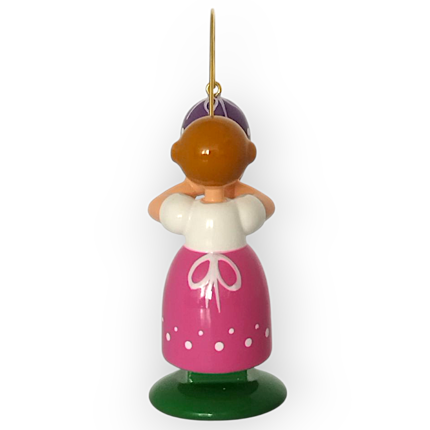 Das Ostermädchen mit dem lilafarbenen Ei strahlt in kräftigen Farben und bringt die Frische des Frühlings in jede Umgebung. Mit einer Höhe von 6 cm steht die Figur sicher auf einem grünen Sockel, der ihre lebendige Ausstrahlung unterstreicht. Ihr Rock leuchtet in sattem rosa, während feine weiße Verzierungen und Streifen das Kleid harmonisch schmücken. Das weiße Oberteil verleiht ihrem Outfit einen schlichten und zugleich eleganten Akzent.