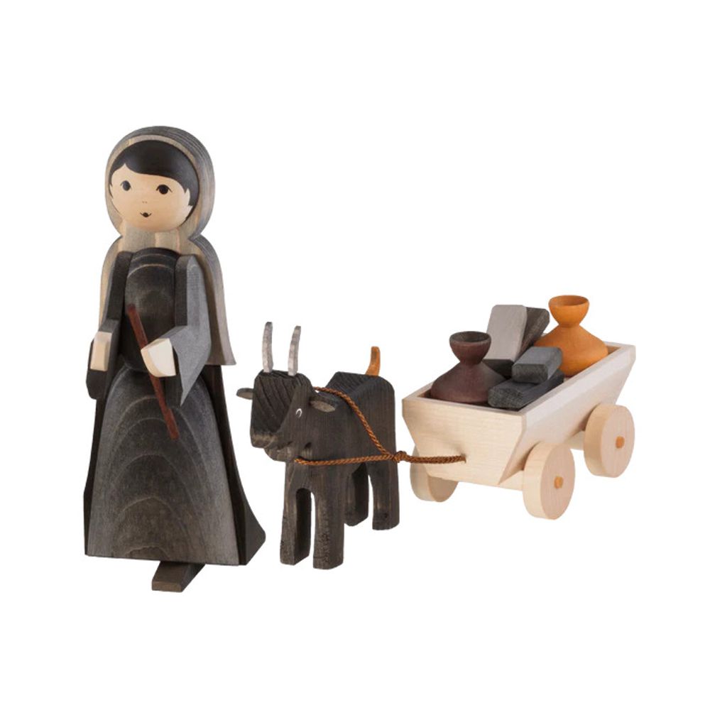 Eine Ziegenhirtin im langen Gewand führt ihre Ziege welche einen Karren voller Tongefäße zieht.